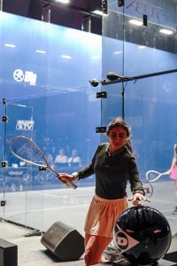 Aboelkheir, who would have been forgiven for a sluggish start, after only landing from the Pakistan World U23 Championships this morning (which she won), raced out to a commanding lead in game one, firing the ball short with great precision and shocked the crowd, winning 11-6.