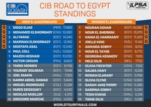 The women’s permutations are fairly simple – Nour El Sherbini will remain #1 if she reaches the final, while Nouran Gohar would need to win the event with Sherbini falling early.